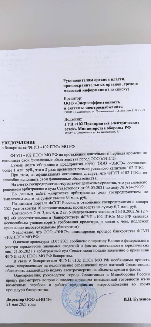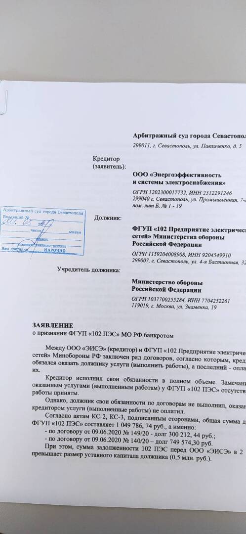 Предприятие энергосетей Минобороны в Севастополе банкротят