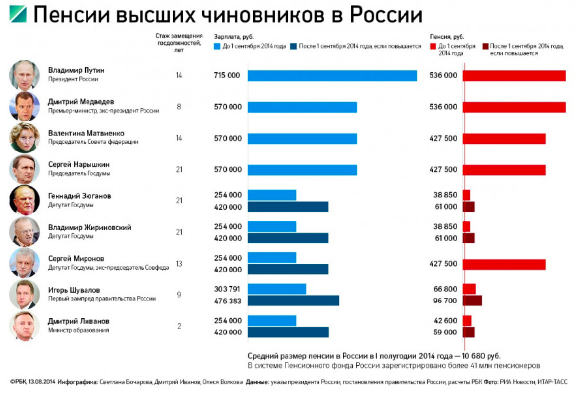 Странный ответ на вопрос "откуда взять деньги". У нас в стране 48 миллионов пенсионеров, а чиновников вы привели всего 9. Причем у некоторых пенсии не такие уж и большие, например у министров, что, кстати, может ставить под угрозу суверенитет государства, так как лица, принимающие важные решения в стране, должны быть обеспечены материально на всю жизнь, чтобы как в 90-е не раздербанили страну за сникерсы и ящик водки. Так откуда брать деньги? Неужели кто-то думает, что у нас низкие пенсии потому что власти жадничают?)