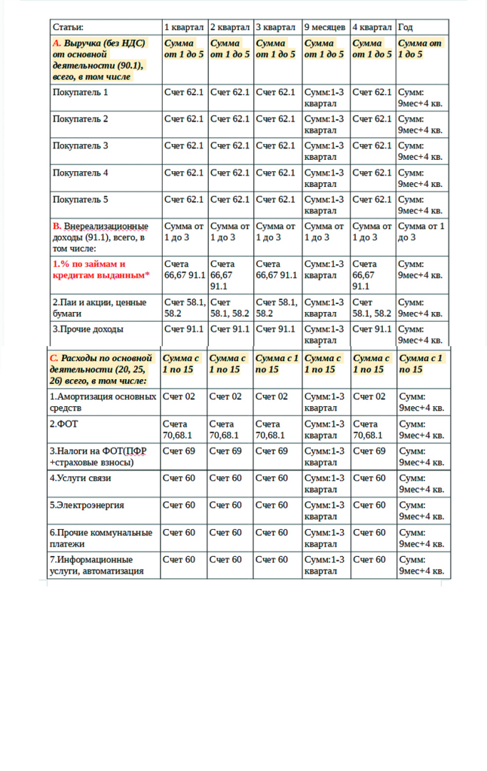 В качестве примера, рассмотрим развернутую модель ОПУ на основе бюджета предприятия, работающего на ОСН, со ссылкой на счета бухгалтерского учета: