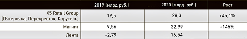Что касается ретейла, то здесь также имеется небывалый рост финансовых показателей. Аналитики РЭУ им. Плеханова подсчитали, что доход торговых сетей от реализации вырос в 2020 году в среднем на 41%, а прибыль – в полтора раза. Показатели чистой прибыли крупнейших ретейлеров выглядят следующим образом: