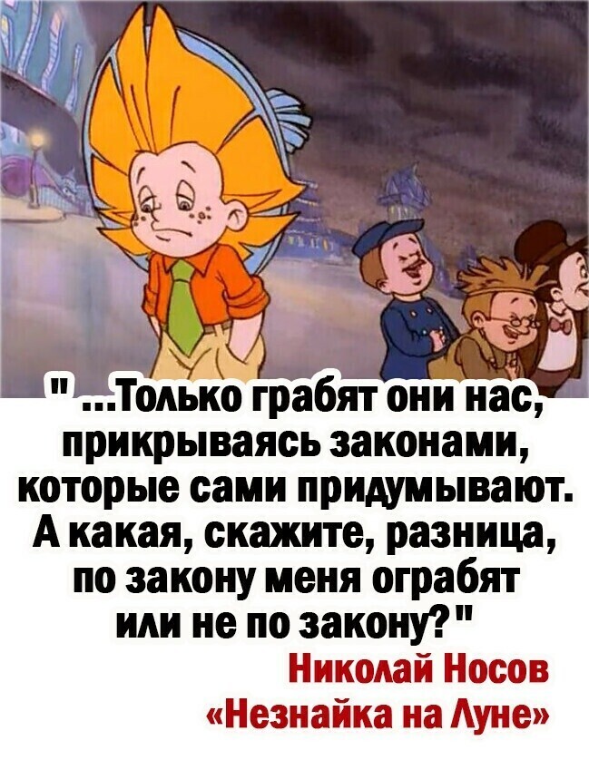 Моя самая любимая книга детства. В библиотеке на всех трёх "Незнаек" была очередь по записи. Читала в 10 лет, я извиняюсь, запоем. А этих выдержек не понимали ещё. Позже, когда читала со своими, дошёл смысл "между строк", но это было позже.