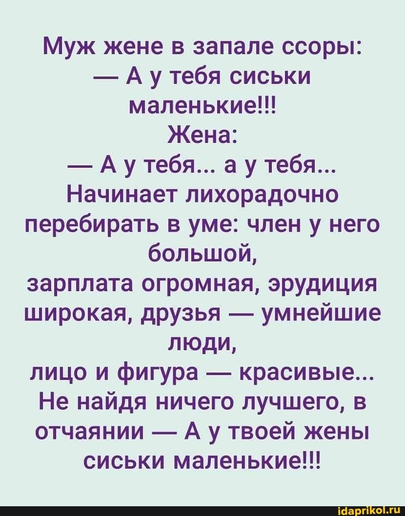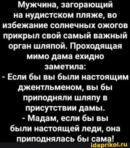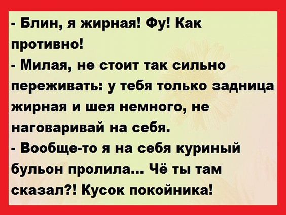 Три монахини хотели пойти на исповедь, поскольку епископ посещал их церковь. Епископа посетила первая монахиня, сестра Мария, в исповедальне она призналась: «Я сквернословила с другой сестрой, ваше превосходительство!» Епископ простил ее, сказал почитать 10 раз молитвы и выпить священную воду. Так она и сделала. Сестра Юнис вошла в конфессию и сказала со слезами на глазах: «У меня был половой акт, ваше превосходительство». Епископ простил ее, сказал почитать 20 раз молитвы и выпить священную воду. И она это сделала. Когда епископ жестом предложил третьей сестре войти, он заметил, что она смеется. Даже когда она села, чтобы признаться, монахиня не переставала смеяться. «Теперь, сестра Джейн, скажи мне, почему ты в таком состоянии здесь, в исповедальне?» Тогда, смеясь, она призналась: «Я н@писала в священную воду!»