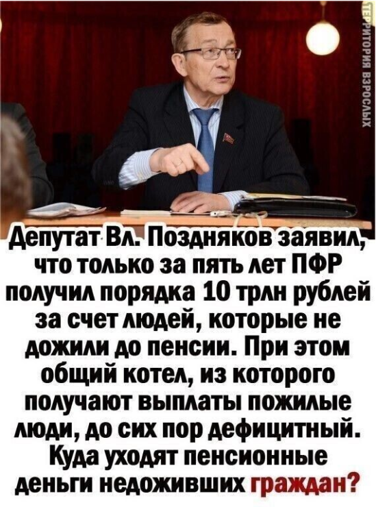Ежегодно в ПФР от работодателей поступает порядка 5 трлн рублей взносов. Ежегодно ПФР выплачивает страховых пенсий действующим пенсионерам порядка 8 трлн рублей. Каждый год эти суммы потихоньку растут. И 5 лет назад они были меньше процентов на 20-30% (т.е. 4 и 5,6 трлн, соответственно). И федеральный бюджет этот "недостаток" покрывал. Таким образом за 5 лет ПФР получил около 10 трлн. Рублей на выплату страховых пенсий действующим пенсионерам. И умершие предпенсионеры тут СОВЕРШЕННО не при чем!