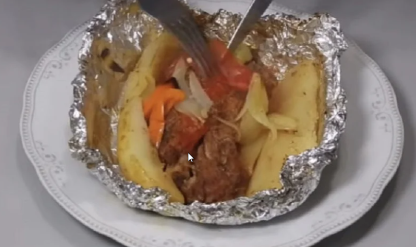 Теперь разбираем приготовленные компоненты на порции. На куски фольги выкладываем овощи, присыпаем их специями (немного), добавляем ребрышки и пару ложек маринада. Заворачиваем фольгу конвертами и укладываем заготовки на противень.