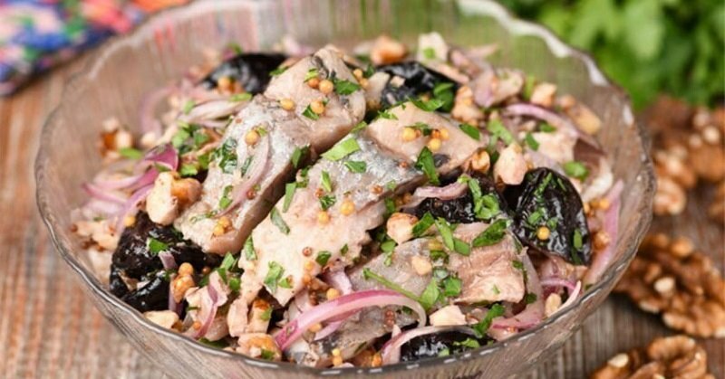 Лук, орехи и чернослив перекладываем в миску удобного объема, добавляем горчицу, масло, свежий сок лимона. Зелень петрушки также мелко рубим ножом и добавляем в миску. Досыпаем перец. Если сельдь слабосоленая, то соль не добавляем. Если взяли свежую рыбу, то добавляем чайную ложку соли. Тщательно перемешиваем. Добавляем в миску подготовленную рыбу и перемешиваем еще раз.