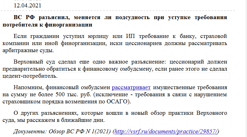 ВС РФ разъяснил, меняется ли подсудность при уступке требования потребителя к финорганизации.