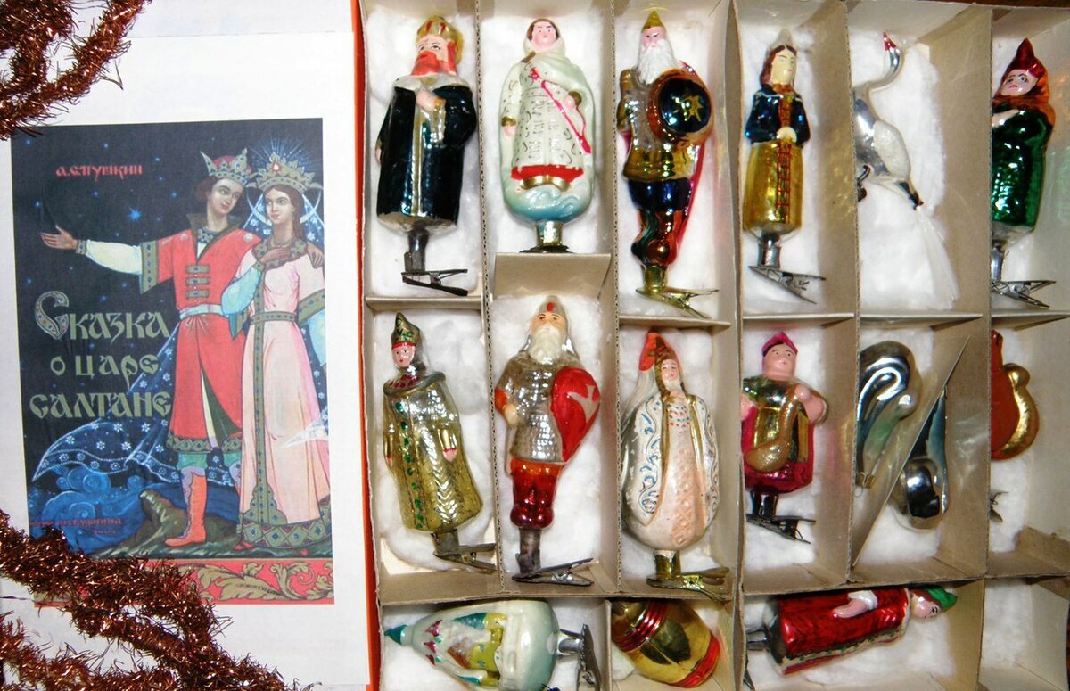 И среди стеклянных игрушек есть свои рекордсмены по ценности. Выпускались тематические наборы стеклянных игрушек. По многим сказкам Пушкина изготавливались комплекты: «Сказка о рыбаке и рыбке», «Руслан и Людмила», «Сказка о золотом петушке», «Сказка о царе Салтане» и др.