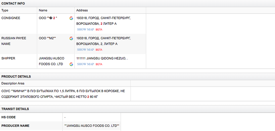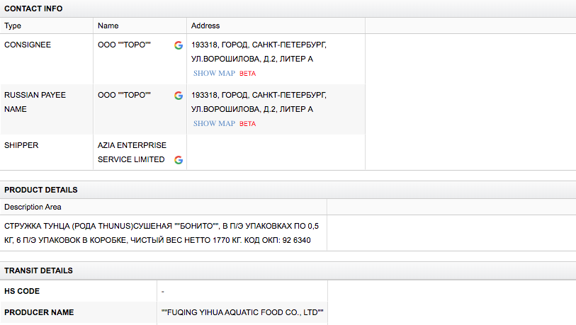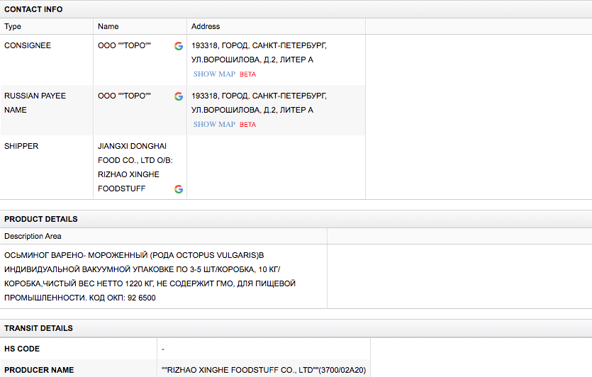 Осьминог варёно-мороженый, угорь жареный, креветки свежезамороженные, филе тунца, филе каракатицы — эти продукты фирма «Торо» поставляла в Россию из Китая, согласно данным базы Import Genius (поставщик бизнес-аналитики для индустрии импорта-экспорта).