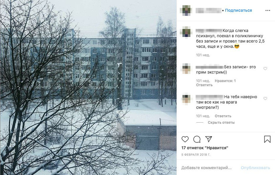 Из постов племянницы Сечина мы также узнаём, что она ездит в обычную городскую поликлинику на автобусе. «Когда слегка психанул, поехал в поликлиничку без записи и провёл там всего 2,5 часа, ещё и у окна», — говорится в одном из постов.