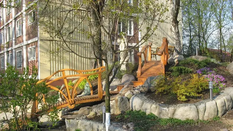 Одноэтажное здание украшают окна разной формы, обрамленные крупными наличниками. В советское время в здании располагался дом отдыха, сегодня там находится единственный в стране санаторий для беременных женщин «Сокольники».