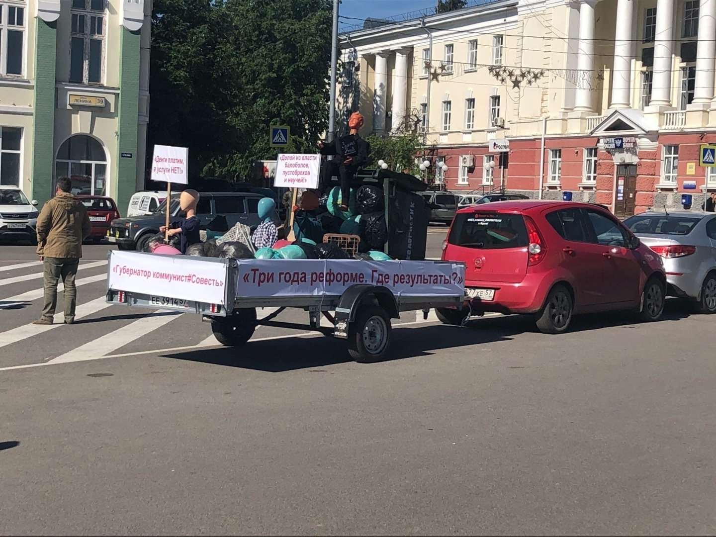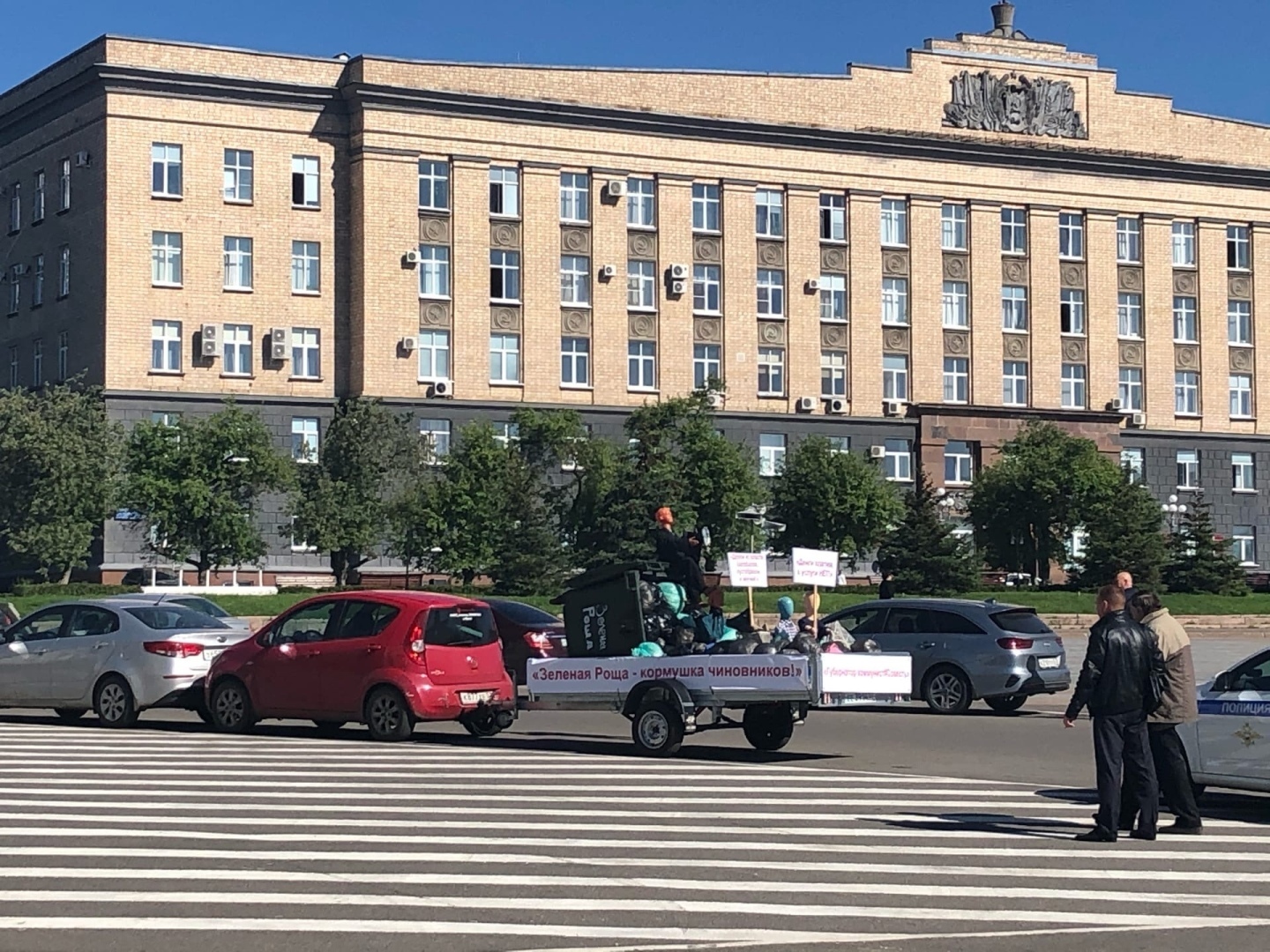 На главную площадь пригнали машину с прицепом, полным мусора. На прицепе навалена куча мусора, стоит мусорный бак «Зеленой Рощи», сидят манекены, в их руках плакаты: «Деньги платим, а услуги нет!», «Долой из власти балаболов, пустобрехов и неучей!». На бортах прицепа нанесены другие лозунги: «Три года реформе. Где результаты?», «Зеленая роща – кормушка чиновников!».