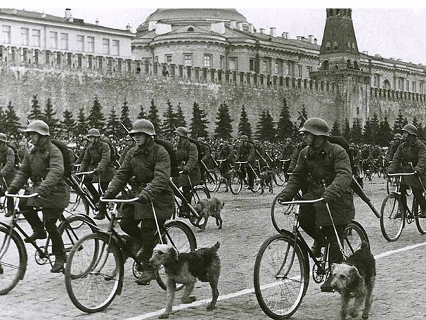 Велосипедные военные собаководы. Парад 1 мая 1938 года