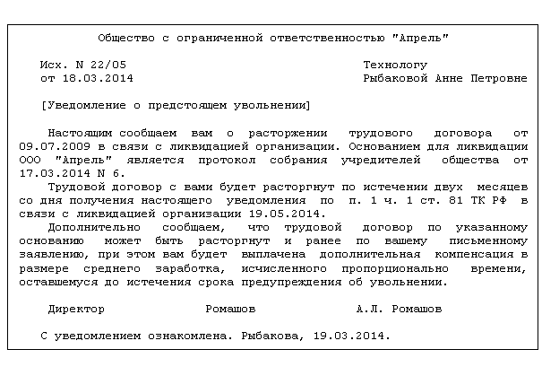 То есть работодатель обязан заранее предоставить сотрудникам уведомление о расторжении трудовых отношений из-за ликвидации организации под личную роспись, и сотрудник считается надлежащим образом уведомленным о предстоящем увольнении только, когда он ставит свою роспись.
