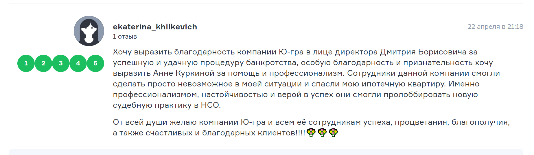 14 апреля 2021 года процедура гр. Е. была завершена, моя клиентка освобождена от долгов в размере 3 351 290 рублей 43 копейки, ипотечная квартира сохранена и в настоящее время выведена из залога.
