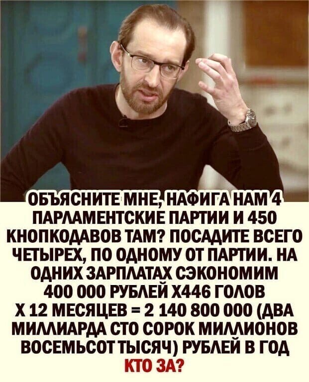 Как мне кажется если сократить число депутатов до 85 (по количеству регионов в России) то ничего абсолютно не изменится, на зато экономия будет около 10 млрд. Руб., которых хватит на индексацию пенсий работающим пенсионерам. Слишком много бездельников там сидит, артистов, спортсменов и даже юристов, которым все принимаемые законы абсолютно по барабану. Они все там сидят только продвигая свой бизнес и только, для этого они туда и рвались. Надо вообще сделать как в СССР, депутаты от станка приехали на сессию, обсуди и приняли законы и дальше по свои рабочим местам. И слишком много льгот у наших депутатов, за свои зарплаты могли бы и на общественном, да и на другом транспорте (поезд, самолет) за свои денежки ездить, как все население России.