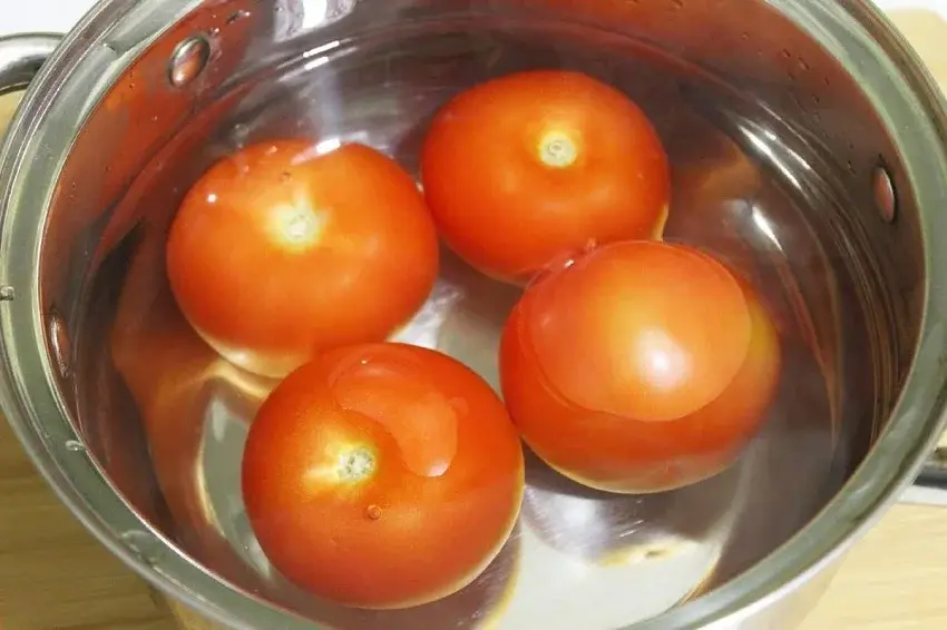 Нам потребуется кастрюля, в нее наливаем воду – столько, сколько потребуется для полного погружения всех помидоров, вкус которых нужно улучшить. Прогреваем воду до 55 – 60 градусов, после чего снимаем кастрюлю с плиты, погружаем в воду помидоры (они должны быть комнатной температуры), накрываем крышкой и оставляем на 15 – 20 минут.