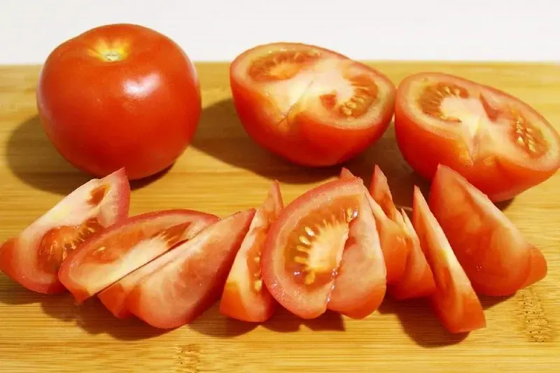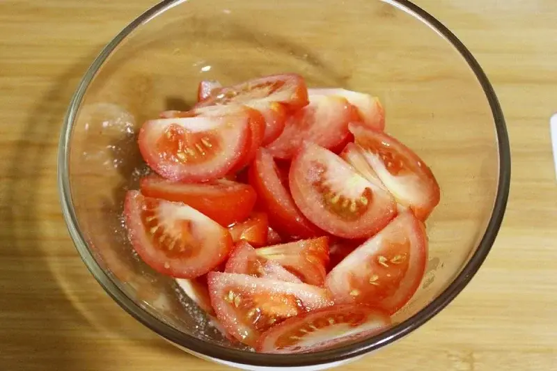 Далее, вынимаем помидоры, даем им полежать в течение часа при комнатной температуре, чтобы они полностью остыли. Нарезаем их острым ножом на ломтики, перекладываем в миску.