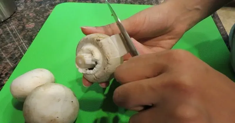 Мелкие грибы чистить не будем. Их можно оставить в целом виде или разрезать пополам – зависит от рецепта и блюда. У крупных грибов разделяем шляпки и ножки, после чего с поверхности шляпок снимаем кожицу. У шампиньонов кожица снимается очень легко – для этого достаточно поддеть тонким ножом край кожицы внизу шляпки и просто потянуть ее вверх – к центральной части гриба.