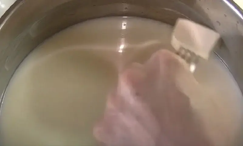 Теперь самое главное. Берем кусочек сливочного масла и промазываем им круг внутри кастрюли, в которой кипит вода с солью. Проводим круг на уровне ручек кастрюли. Теперь аккуратно переливаем в кипящую воду сладкое молоко (сахар должен полостью раствориться). Благодаря кругу, проведенному сливочным маслом, молоко в процессе кипения не сбежит, так как пенка не будет подниматься выше этой границы.