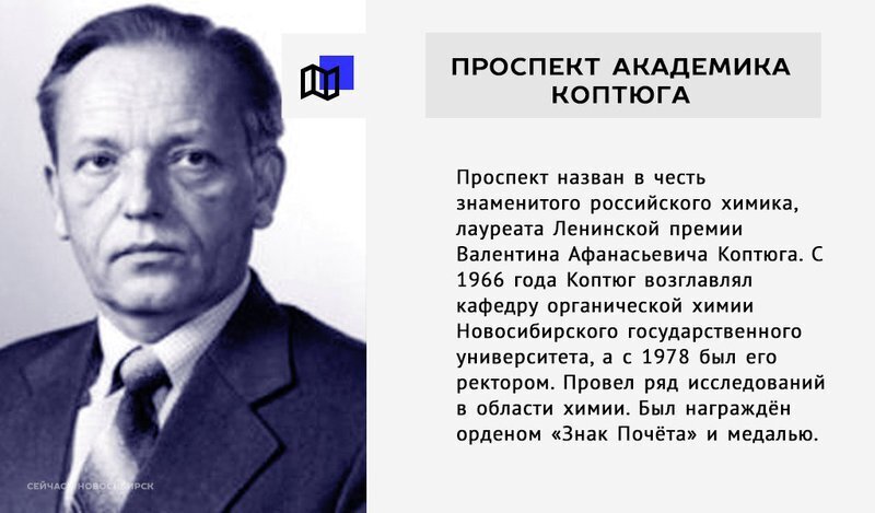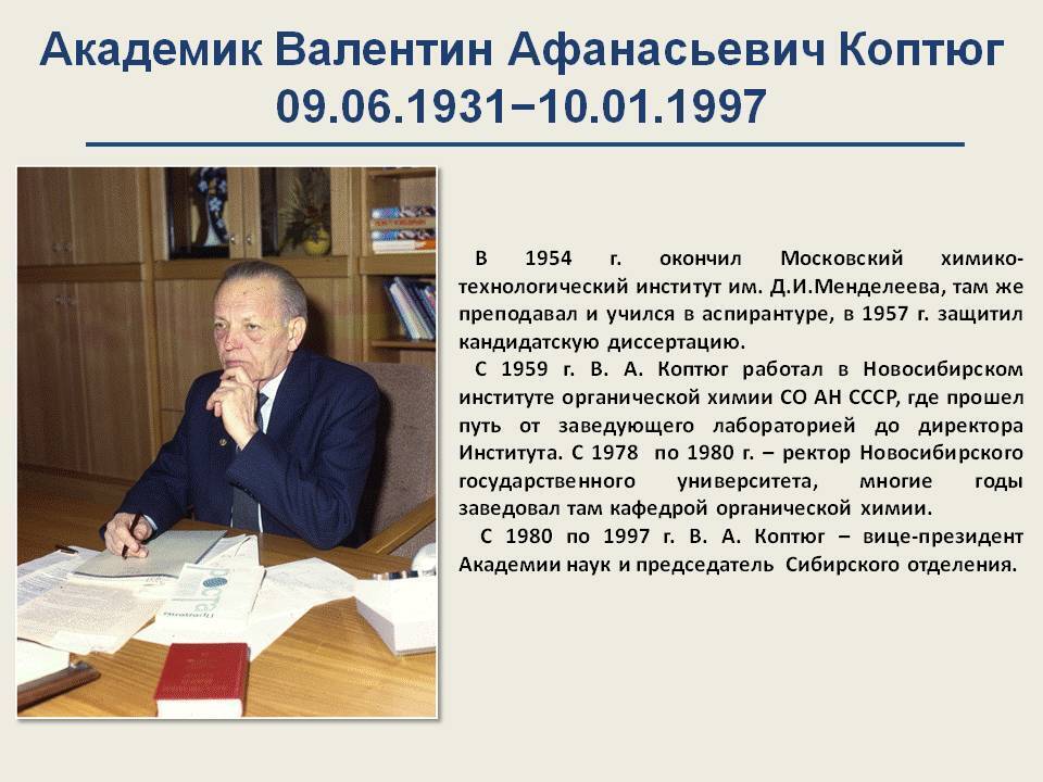 В.А.Коптюг - советский и российский химик, академик АН СССР (1979), вице-президент РАН, председатель Сибирского отделения РАН. Герой Социалистического Труда (1986), лауреат Ленинской премии (1990).