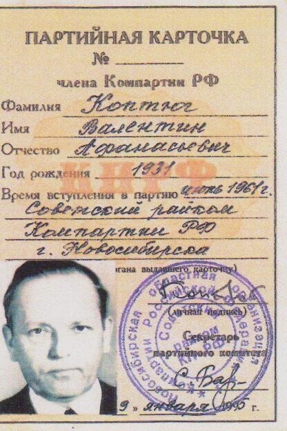 В тяжелейшее время для коммунистов и всех советских патриотов в начале 90-х годов Валентин Коптюг не бросил партийный билет, не отрёкся от идей коллективизма, социального равенства, справедливости, как это сделали отдельные, в том числе и весьма "высокопоставленные", представители науки, получившие от КПСС и Советской власти всё - степени, звания и чины. Он направил все свои усилия на то, чтобы отстоять честь запрещённой Ельциным партии в Конституционном суде, защитить достоинство и заслуги миллионов советских коммунистов. Решающую помощь оказал Валентин Афанасьевич в возрождении партийной организации Советского района и Новосибирской области.