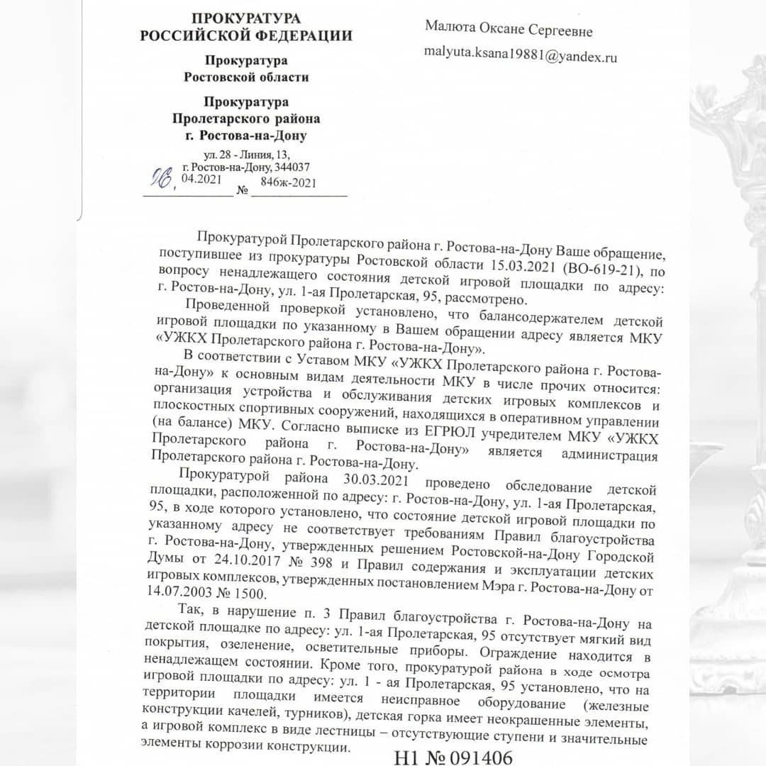 Я написала жалобу в прокуратуру. Прокуратура в свою очередь вынесла предписание управлению благоустройства, то есть администрация обязана отремонтировать детскую площадку в короткие сроки. Теперь я жду, как это сработает на практике. Пока детская площадка никем не ремонтируется. Ответ прокуратуры см. ниже. Только я ещё просила в своей жалобе проверить целевое выделение средств управлению благоустройства, но прокуратура сделала вид, что с моей стороны такого обращения не было, поскольку в ответе прокуратуры по данной части ничего не сказано)))