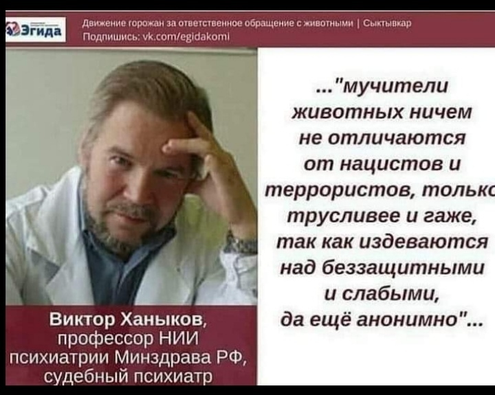 Но степень защиты братьев меньших – один из важнейших измерителей нравственности общества, наряду с отношением к детям, инвалидам и старикам, и в цивилизованных странах не отделяется от них. Теперь по теме. Будучи психиатром, в том числе на протяжении 5 лет – судебным, проведя через комиссии около 140 обвиняемых в тяжких преступлениях и участвуя во многих сотнях таких же экспертиз своего отдела, я могу гарантировать, что жестокость не бывает «частичной».