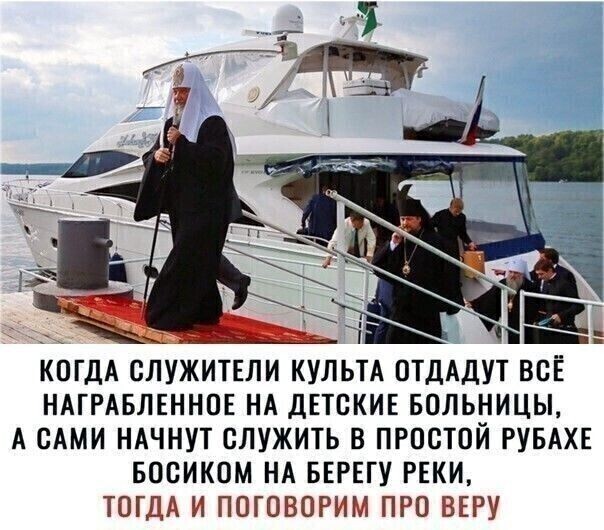 О! Что же я думаю? А я вообще ничего уже давно не думаю, по поводу наших служителей церкви... особенно Кирилла нашего! Он также как и правительство, слишком далеко от народа, а от Господа нашего ещё дальше! Господи прости!🙏 дорогие дома, квартиры, машины, яхты, самолёты, часы по цене дороже квартиры. Это откуда? А главное, зачем? Не стыда, не совести нет! Зачем нам нужен такой наставник? Лично мне, незачем!