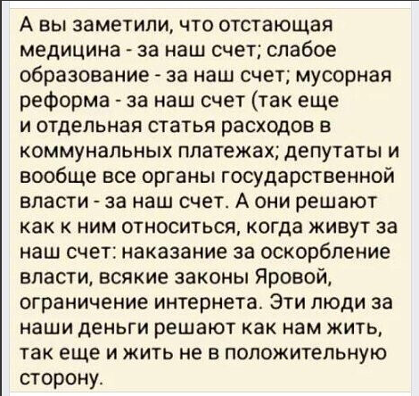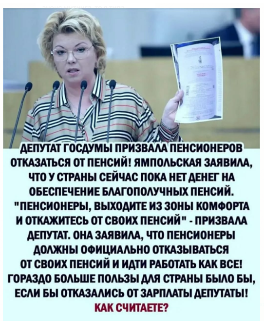 Малиновые пиджаки криминальных авторитетов исчезли с поля зрения общественности… чтобы плавно переместиться в кресла парламента и прочих структур, близких к кормушке и лоббированию собственных интересов бизнеса. Вкусив прелести мандатов, дающих неприкосновенность и возможность «стряпать» законы под себя и за это — дополнительно собирать мзду со своих бывших подельников прошлого криминального бизнеса. Сплошной почёт и «уважуха»… нескончаемый поток конференций, мелькание на экранах зомбиящиков с проплаченными заведомо журналистами-шлюхами, берущих интервью, поднимающих рейтинг «радетеля народных интересов»… встречи с избирателями, которых надо вовремя перед выборами «подкормить», да и… с барской руки скинуть старикам-пенсионерам (наиболее надёжной части электората) бутылёк контрафактного шампанского, разлитого в подвалах какой-нибудь Борвихи… И главное, пообещать доверчивым жертвам радужных перспектив на будущее, как то — индексации пенсии, работающим пенсионерам в размере двух чашек разбодяженого кофе в районе привокзальных столовок. При этом памятуя, какую (!) сделку века совершили депутаты, путём обмана предпенсионеров… реформа века - пенсии утрата, кто не дожил сам пусть ВИНИТ СЕБЯ за это! Единая Россия (!) как мощна ты, решая судьбы миллионов лишь диженьем пальцев, неимоверный приносящий вам доход… Нажал на кнопку правильно — ты в доле — от ПФР получишь свой Кэш Бэк… как минимум % двадцать, от тех — кого зарыть успел… Ты, депутат, «слуга народа»?! Скорей всего — его могильщик — ТЫ !!!