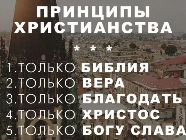 Самый главный принцип Sola Scriptura – «Только Писание». Этот принцип гласит о том, что кроме Библии ни один другой текст не может быть достоверно подтвержден, что он от Бога. Но ни католическая церковь, ни православная, конечно с этим не согласятся, так как тут же потеряют свои "наработки" по созданию фанатиков за сотни лет: предание «святых» отцов, решения соборов и т.п.