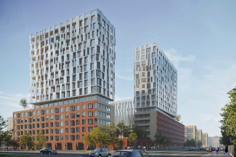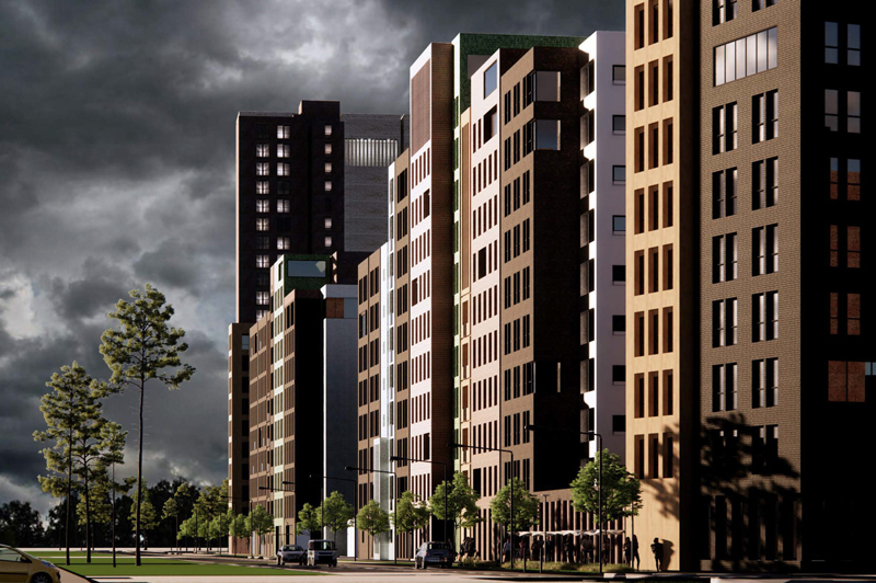 Проекты участников «Эталонпроект» + Citymakers + Modul Architectural Bureau выбрали для своего участка концепцию «Мимикрия». Авторы выделили в районе застройки несколько самых значимых объектов. Их цвет и материалы повторяются с небольшими изменениями в архитектуре новых фасадов.