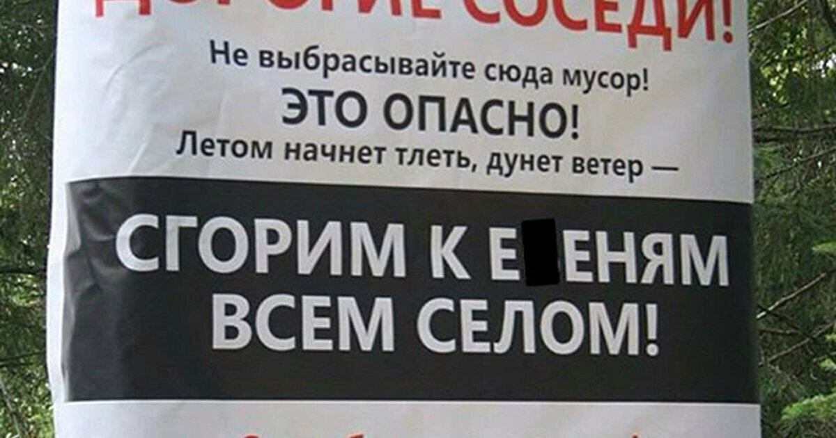 Самый простой способ договориться с соседями - говорить на одном языке! Даже если это такая смешная лексика. Зато сколько эмоций сразу после прочтения, хочется все убрать в округе, а это фото отправить всем друзьям.
