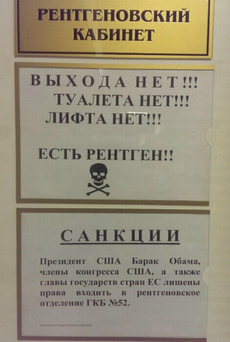 Многие, даже если прочитают это объявление несколько раз, все равно зайдут и спросят нет ли здесь выхода! А ещё Барак явно обиделся, ведь он только и мечтал, что посетить нашу муниципальную больницу.