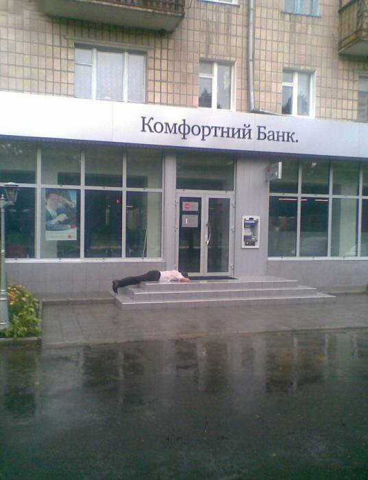 Можешь чувствовать себя в этом банке - как дома! Даже поваляться на ступеньках у дверей.