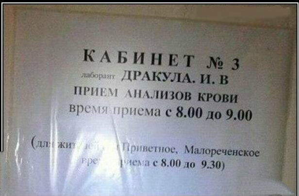 Если бы мне попался врач с такой фамилией, я бы передумала идти сдавать анализы. Хотя как-то я пошла в стоматологию и моего врача звали Бескровная... Было жутко!