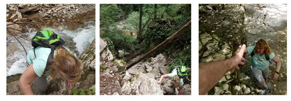 Каньон для прохождения оказался очень сложным и местами даже опасным. Порой приходилось карабкаться по мокрым скольким камням, многократно переходить реку вброд. В одном месте, где, по-видимому, весной сошла сель, я даже запаниковала, так как не могла найти, за что зацепиться руками и ногами, они просто съезжали по скользкой глине. И все это происходило над пропастью высотой не менее 10 метров. Одно неловкое движение, и полет с обрыва тебе обеспечен. Но муж меня подстраховал, и мы выбрались. Сколько раз потом мне снился этот жуткий участок маршрута! Такие сложные места, нам, конечно же, не удалось зафиксировать на фото, так как руки и ноги были в это время заняты. Но вот несколько кадров, как я преодолеваю маршрут на средних по сложности участках.