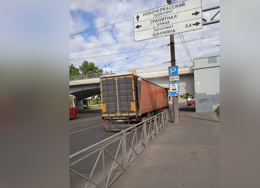 Сегодня утром на Дальневосточном проспекте в Невском районе под железнодорожным переездом застряла фура. Очевидцы поделились фото произошедшего в социальных сетях.
