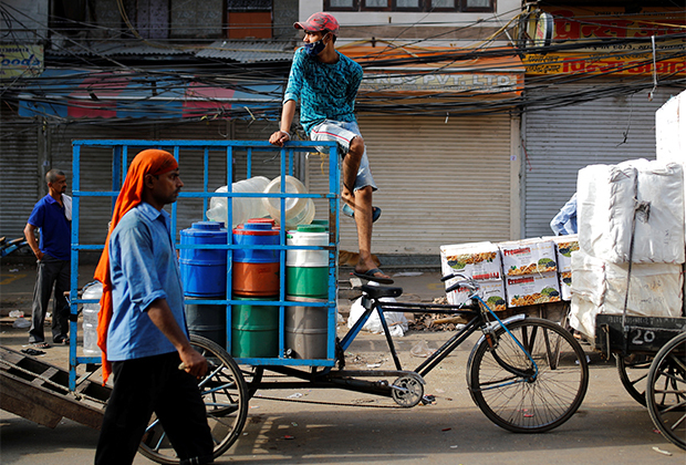 Рикша на городском рынке после смягчения локдауна в Дели.
