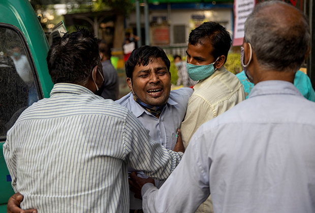 Люди оплакивают смерть родственника возле больницы в Нью-Дели.