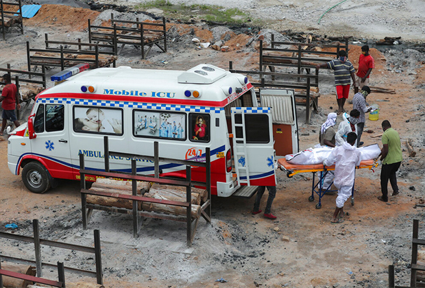 Тело умершего от COVID-19 выгружают для кремации на погребальном костре.