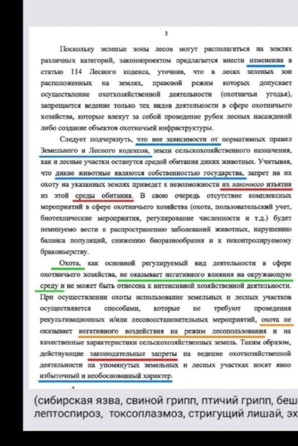 Если кто не понимает, то поясню: по сути в окончательной редакции поправки заключаются в разрешении охотничьего хозяйства на сельхозземлях, расположенных ближе тридцати километров от сельских населенных пунктов (соответствующие изменения вносятся в ч. 4 ст. 78 Земельного кодекса РФ), и в зеленых зонах (соответствующие изменения вносятся в ч. 4 ст. 114 Лесного кодекса РФ).