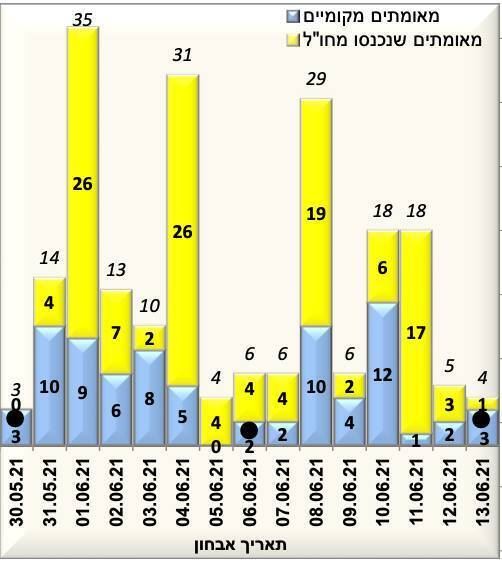 Во вложении статистика новых случаев в Израиле за последние 15 дней: импортированные - желтые столбики, внутренние передачи - синие. Передача в сообществе в среднем 5 в день, 0,5 на миллион населения. Это уровень, на котором отслеживание и изоляция контактов могут остановить передачу".