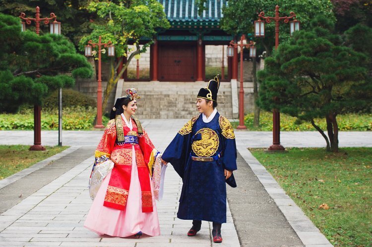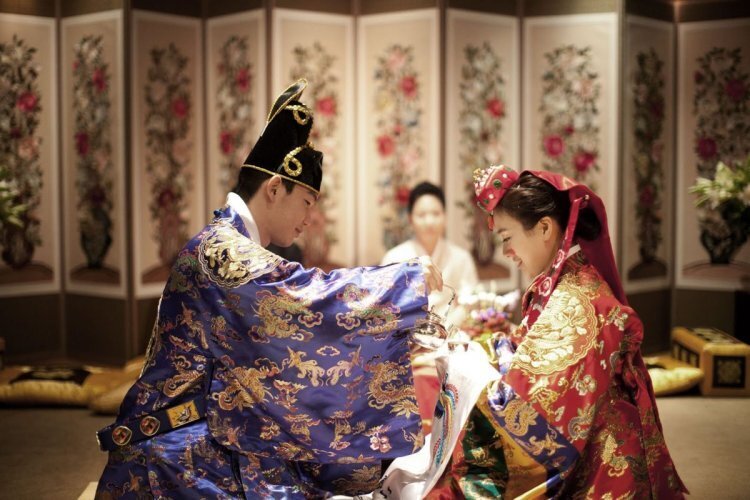 Мы с радостью кричим жениху и невесте «Горько», чтобы увидеть их поцелуй, подтверждающий обоюдную любовь и согласие. На церемонии в Корее все происходит иначе. Многочисленные поцелуи не украсят свадебное видео, ведь вместо таких прелюдий на свадьбе молодожены клянутся прожить вместе в мире и согласии и отпивают напиток из бокалов друг друга. Согласно древним традициям, целоваться на корейской свадьбе не принято, и это даже считается аморальным в отличие, например, от цыганской свадьбы, где молодых чуть ли не каждые пять минут просят поцеловаться.