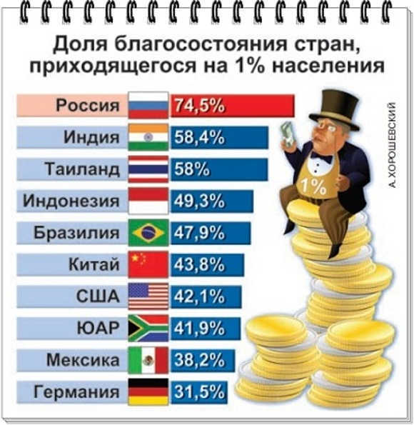 Как подсчитало издание Financial Times, в России сейчас наблюдается самая высокая концентрация богатства в мире относительно размера валового внутреннего продукта: состояние российских миллиардеров составляет 35% (!) от ВВП страны.
