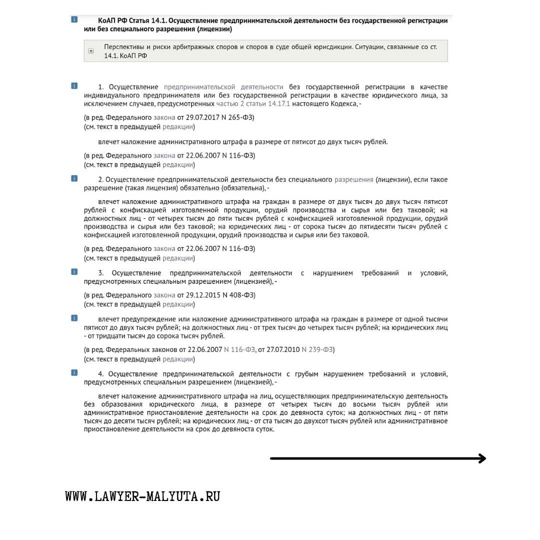 Незаконное предпринимательство – это ведение деятельности, направленной на получение прибыли, без регистрации согласно требованиям законодательства РФ или без лицензии в тех случаях, когда наличие такой лицензии является обязательным (ст. 171 УК РФ, ст. 14.1 КоАП РФ).