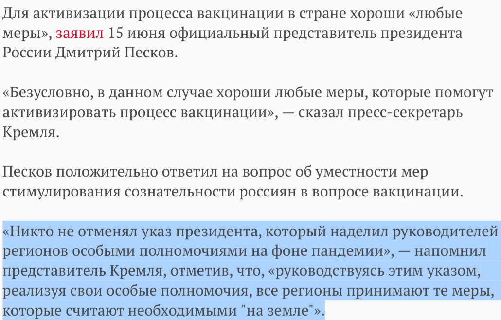 Как это понимать, если одно противоречит другому? Или Дмитрий Песков имеет ввиду вакцинацию всей России в целом?