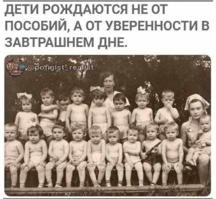 - Фофа, аууууу, какие дети ты обчЁм???? в таком дурдоме, который устроен правительством (хун**й) под твоим руководством, РАЗВЕ ДЕТЕЙ РОЖАЮТ, такому дурдому нужны только рабы (налогоплательщики и доходами в МРОТ), А ДЕТИ И ЛЮДИ (ГРАЖДАНЕ) нынешней *унте не нужны....