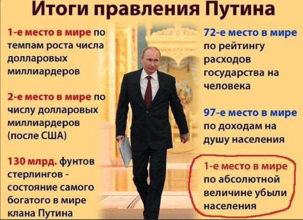 А он случайно не знает, кто Россию толкает в эту яму? Как руководитель страны он должен был предвидеть, к чему приведет такое управления страной.Страна с нищим народом, не может быть Великой, благосостояния народа и есть величие страны, а не отдельных групп людей.