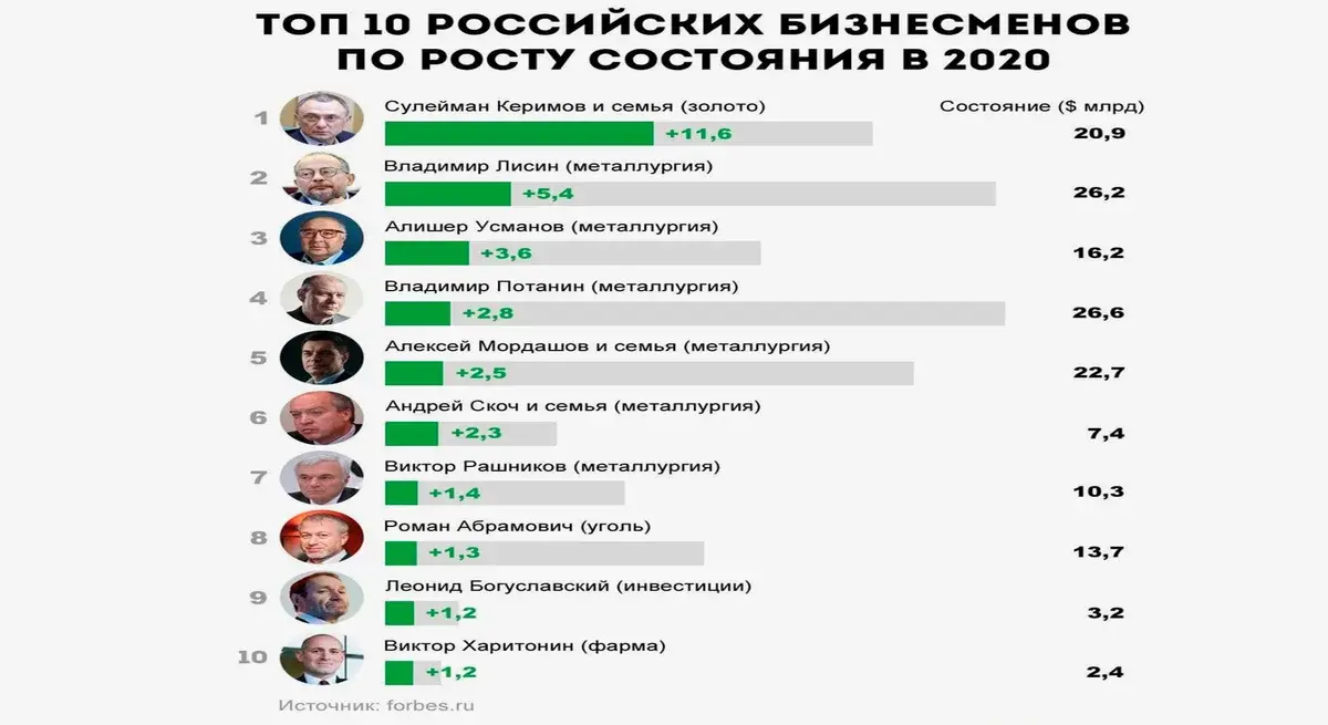 Однако нужно помнить, что это проблемы трудовой России, то есть России большинства. У правящего класса все гораздо лучше, они собирают форумы, обсуждают свои бизнесы, инвестиции, экономику, ведь их капиталы только растут. Лишь за 2020 год состояние богатейших олигархов значительно выросло.