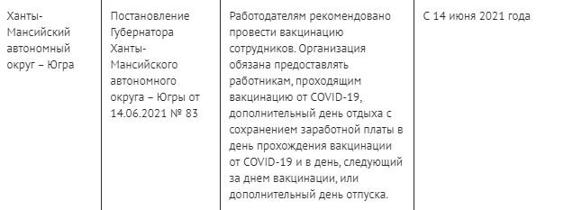 Обязательная вакцинация коснулась и граждан Ненецкого автономного округа (НАО). Вакцинацию среди прочих должны пройти вахтовики, а также лица, подлежащие призыву на военную службу, волонтеры, военнослужащие, работники сферы услуг, торговли, государственные гражданские и муниципальные служащие, студенты старше 18 лет. 21 июня стало известно о введении обязательной вакцинации в Краснодарском крае, в Башкирии.